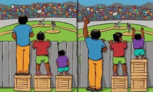A expressão “scaffolding” em contexto pedagógico é utilizada para nomear um conjunto de estratégias educacionais que busca promover a equidade dentro da sala de aula. E, antes que possamos discutir sua aplicabilidade no dia a dia escolar, é importante que compreendamos com clareza o objetivo e a importância de nos apropriarmos e fazermos uso constante de técnicas de scaffolding. Recupero uma imagem veiculada no Jornal da Paraíba para lembrarmos da diferença entre igualdade, representada pela figura da esquerda, e equidade, representada pela figura da direita.